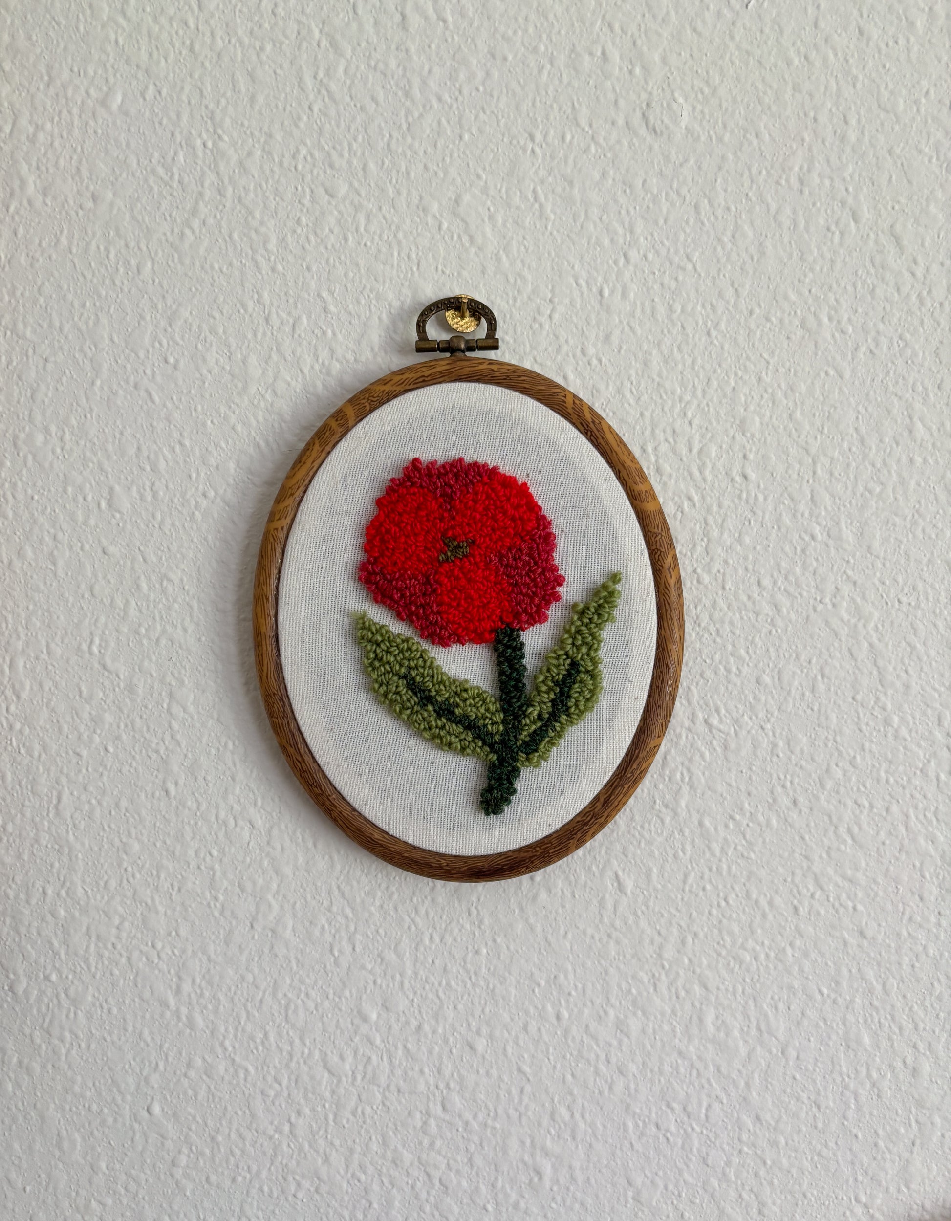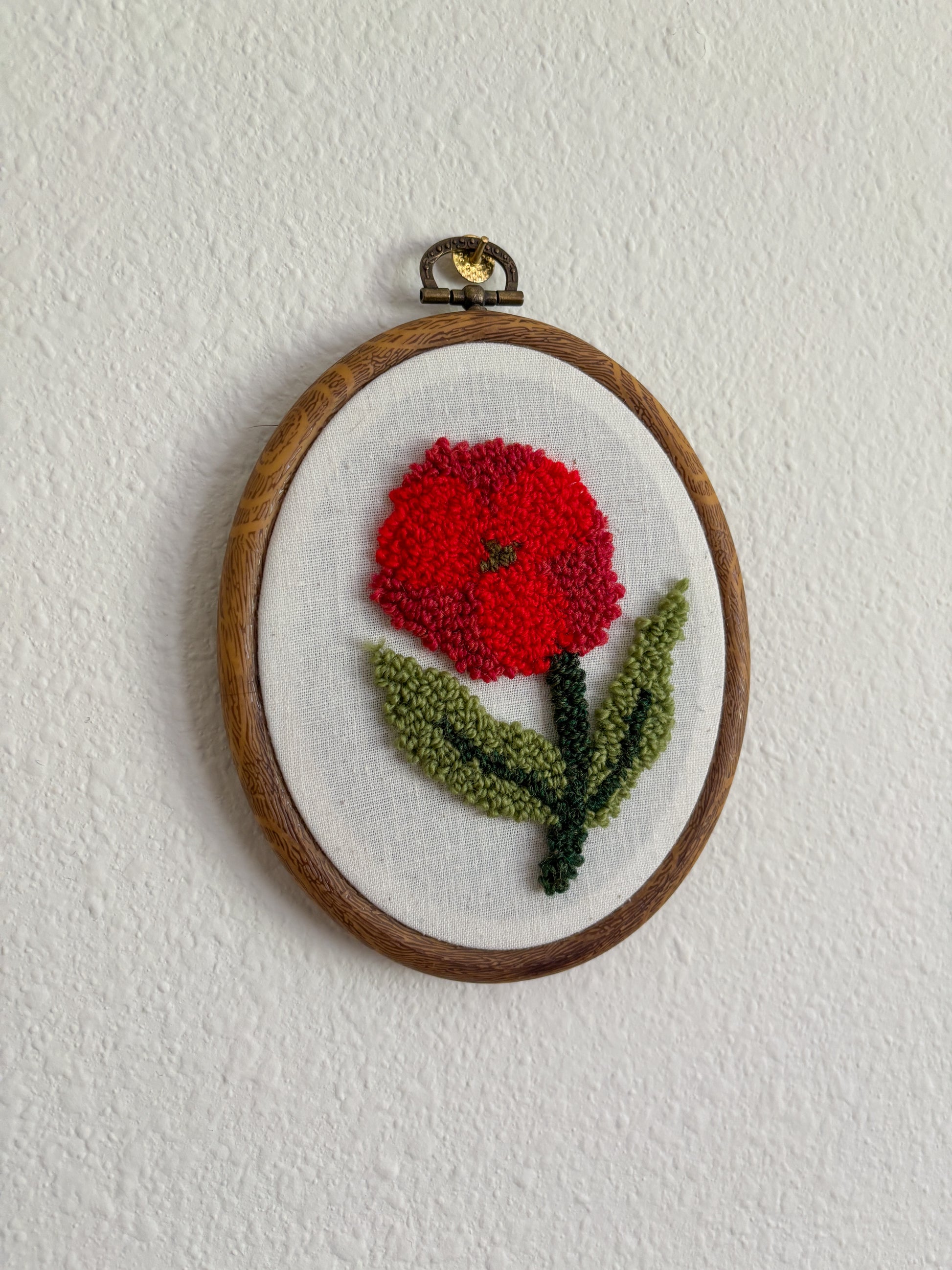 Embroidery hoop, wool yarn, linen fabric.