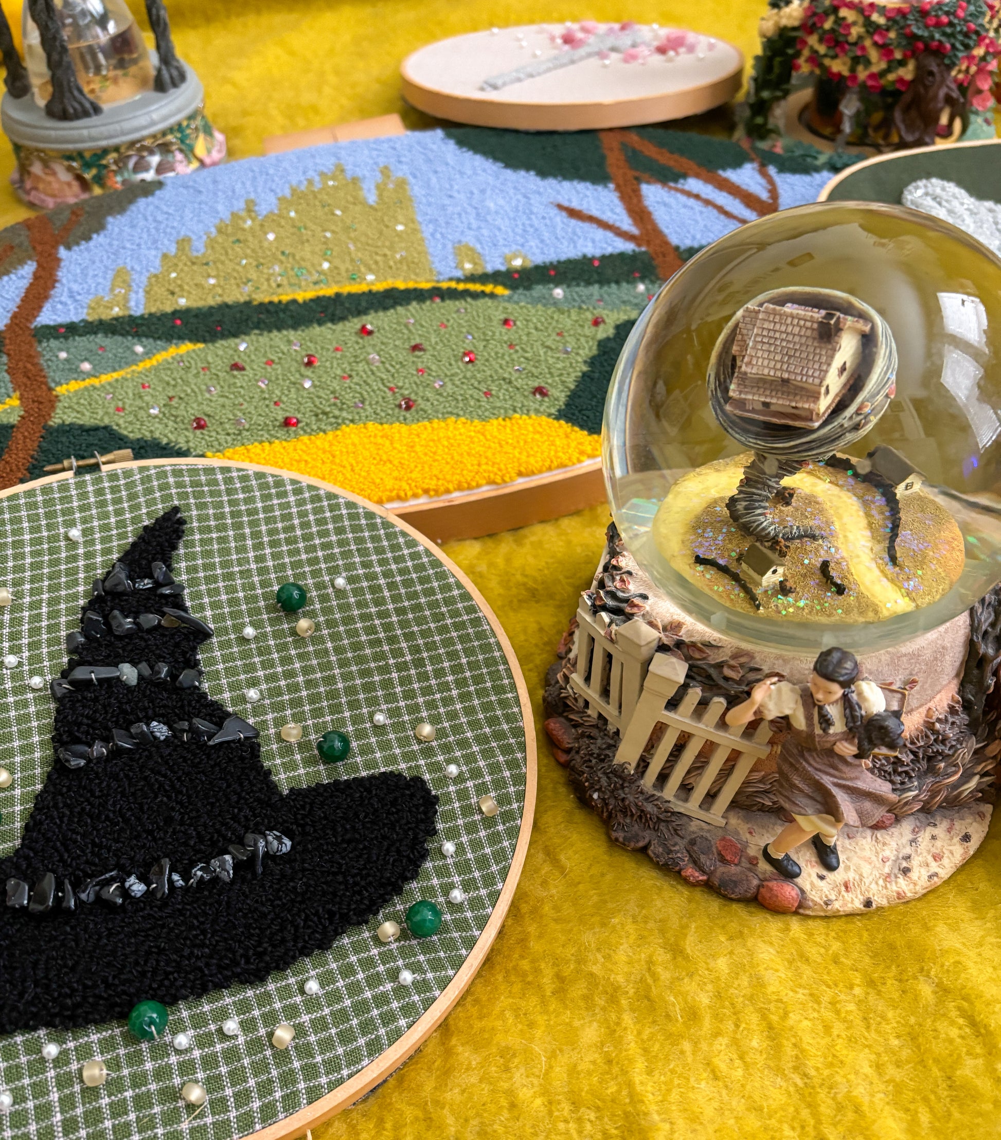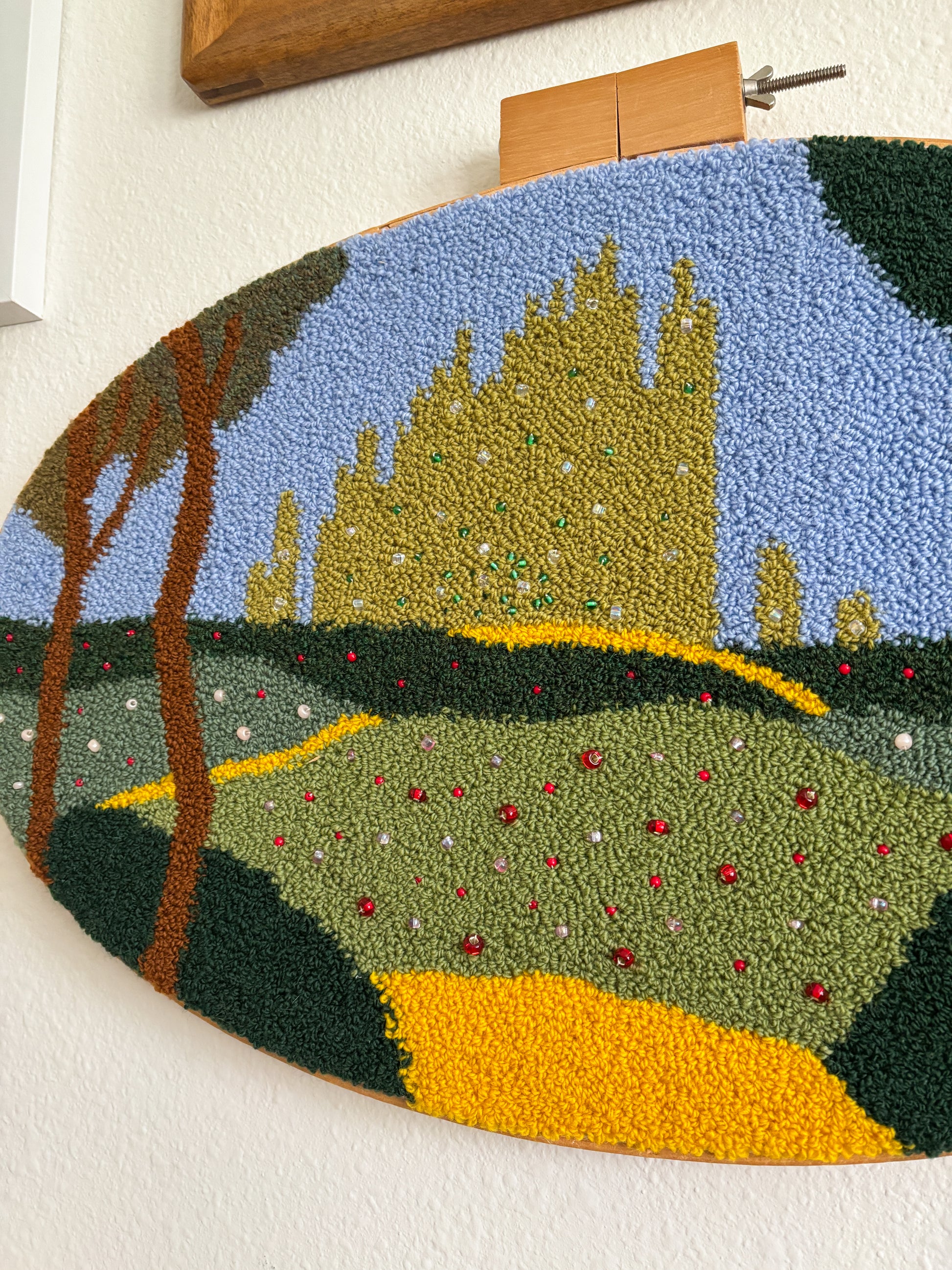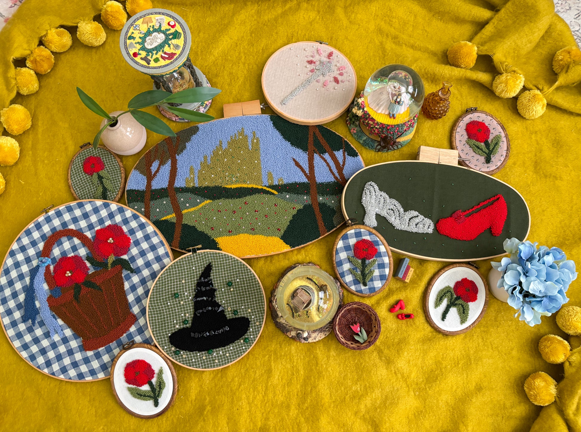 Inspired by the Wizard of Oz. You've finally arrived to the Emerald City. This piece was a true labor of love, hand punching every stitch in the hoop to give you the feeling of stepping out of the woods into a new adventure. Following the iconic road to a new world, filled with beads hand sewn into place to replicate the glowing feeling of the Emerald City and the poppy field that surrounds it.