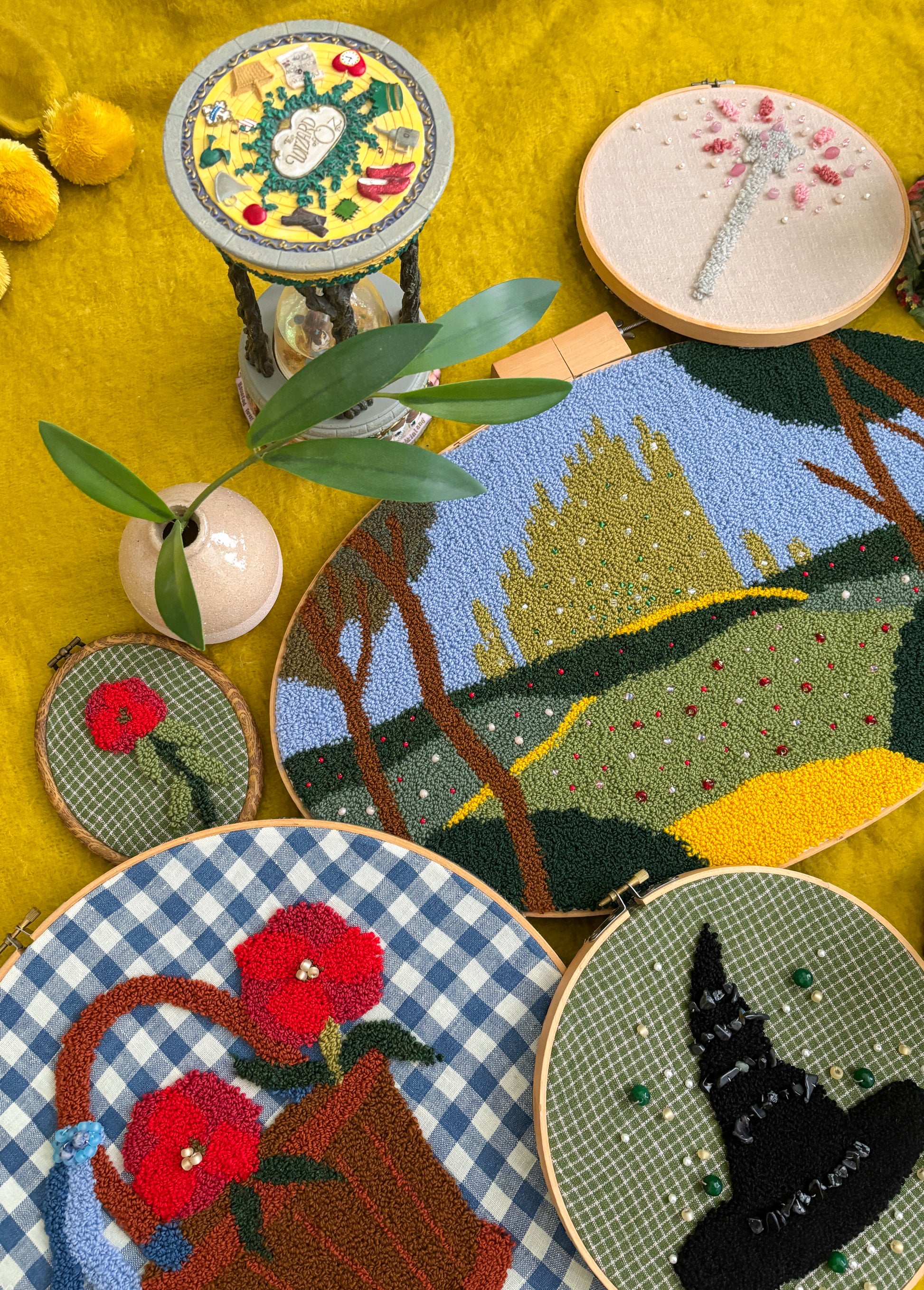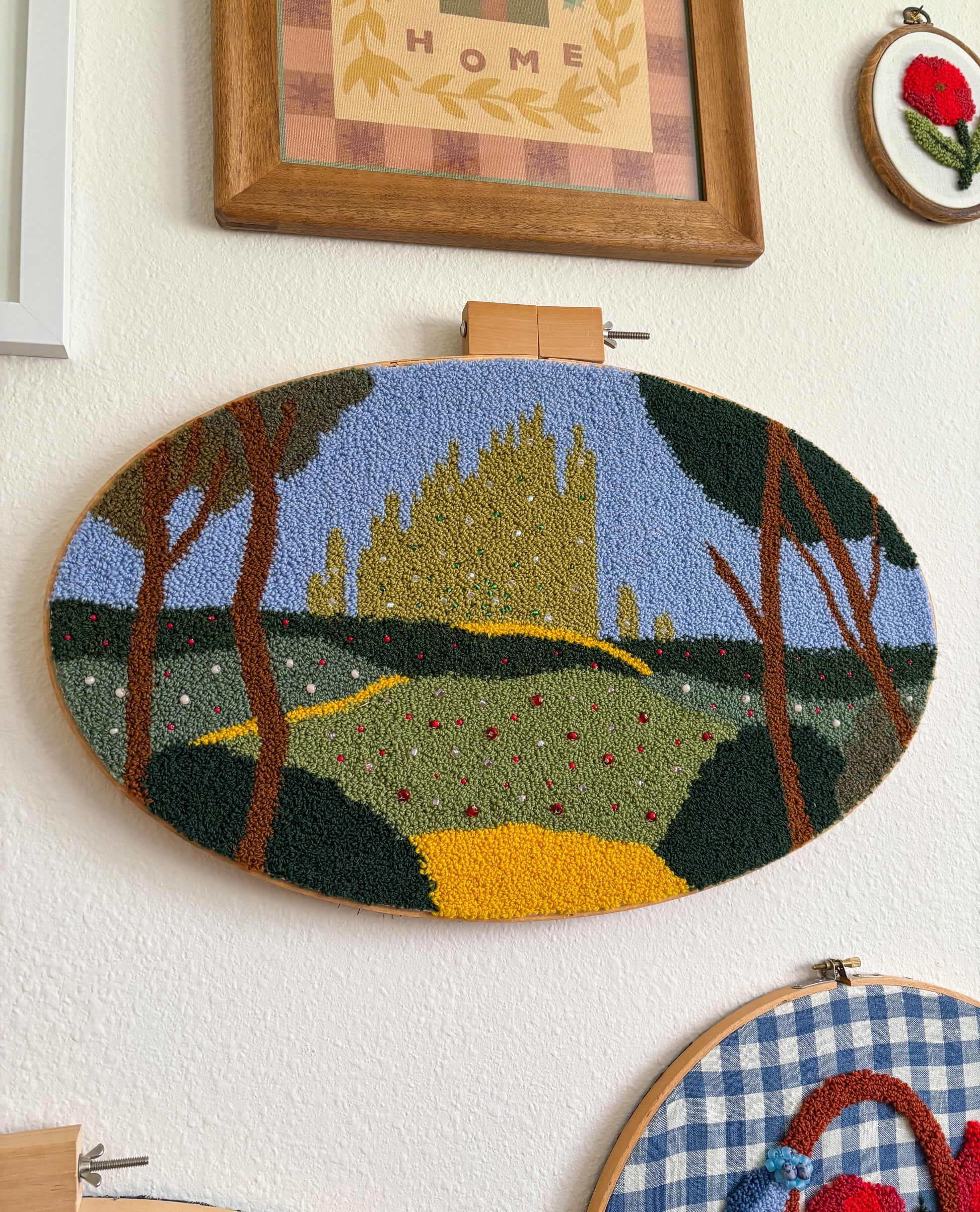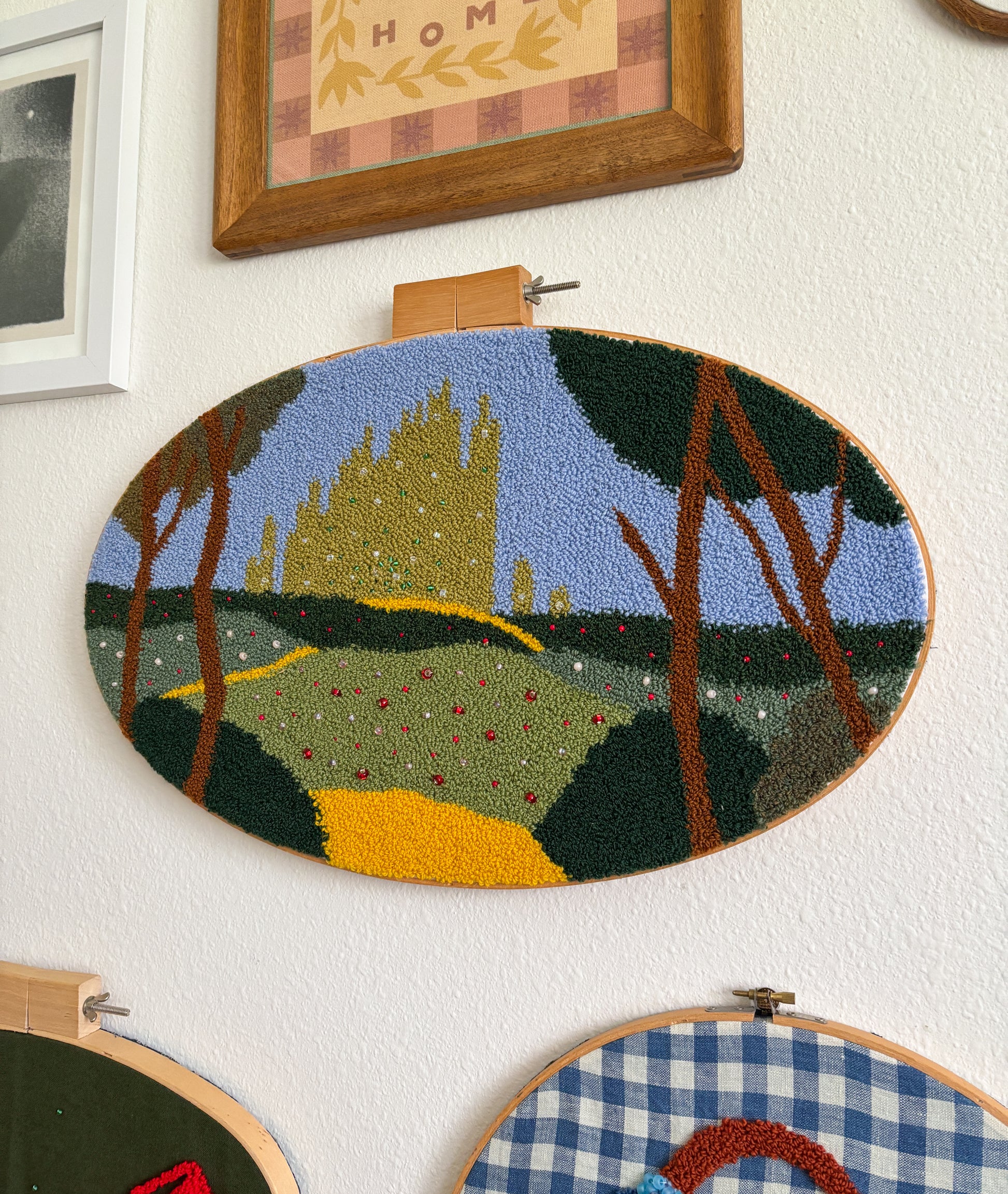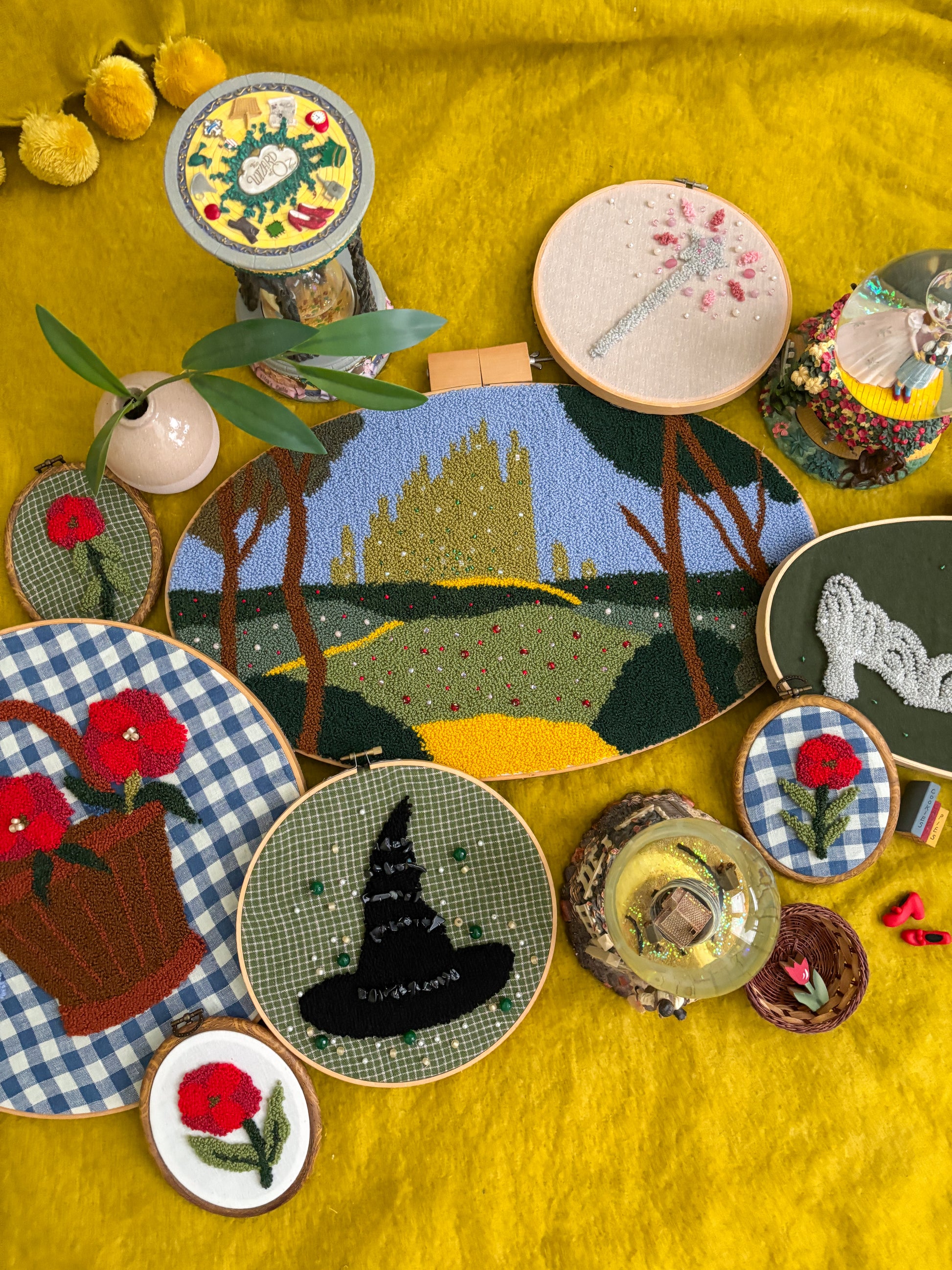 Inspired by the Wizard of Oz. You've finally arrived to the Emerald City. This piece was a true labor of love, hand punching every stitch in the hoop to give you the feeling of stepping out of the woods into a new adventure. Following the iconic road to a new world, filled with beads hand sewn into place to replicate the glowing feeling of the Emerald City and the poppy field that surrounds it.