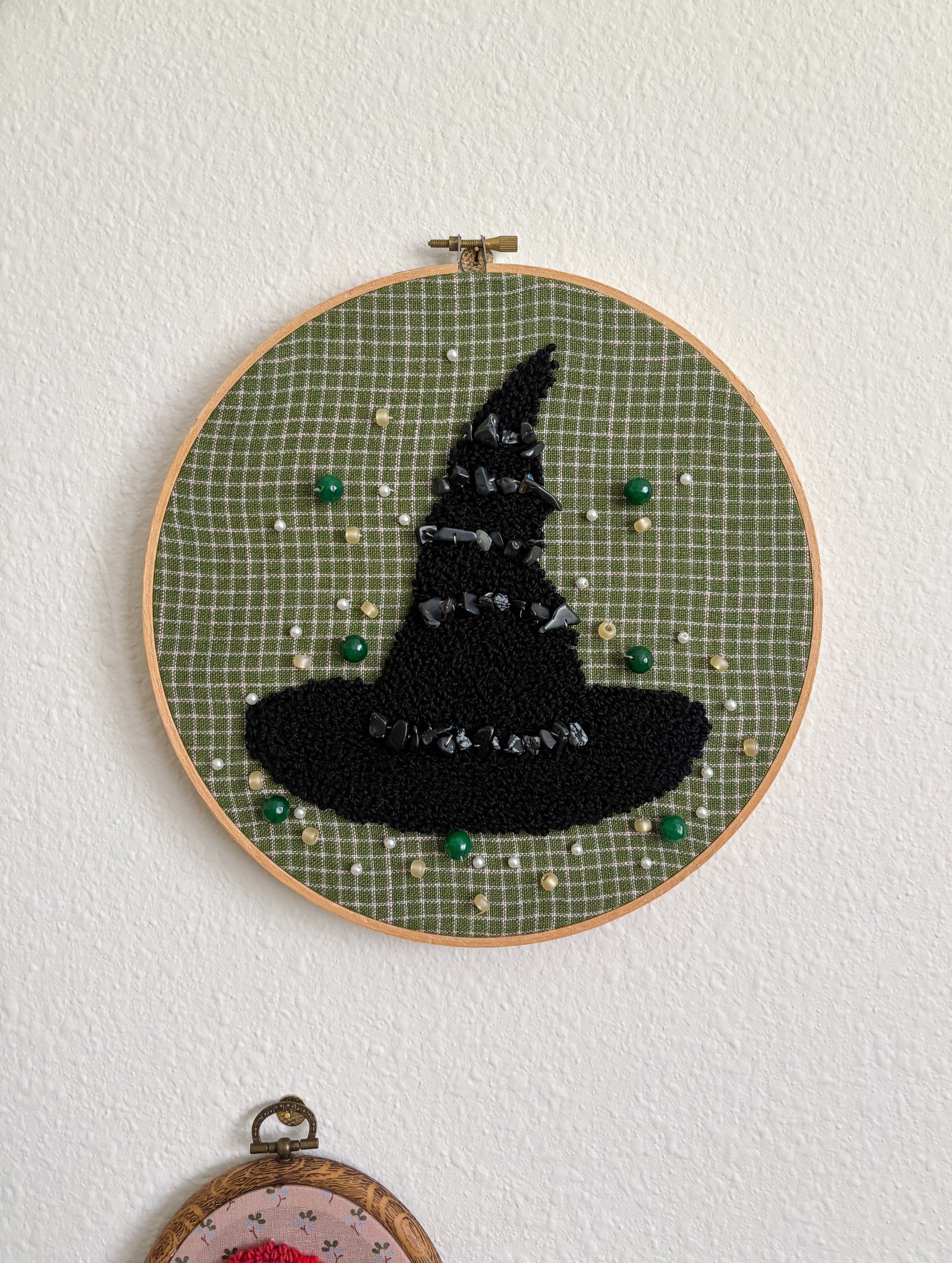 This piece can be hung by the loop at the top of the hoop.