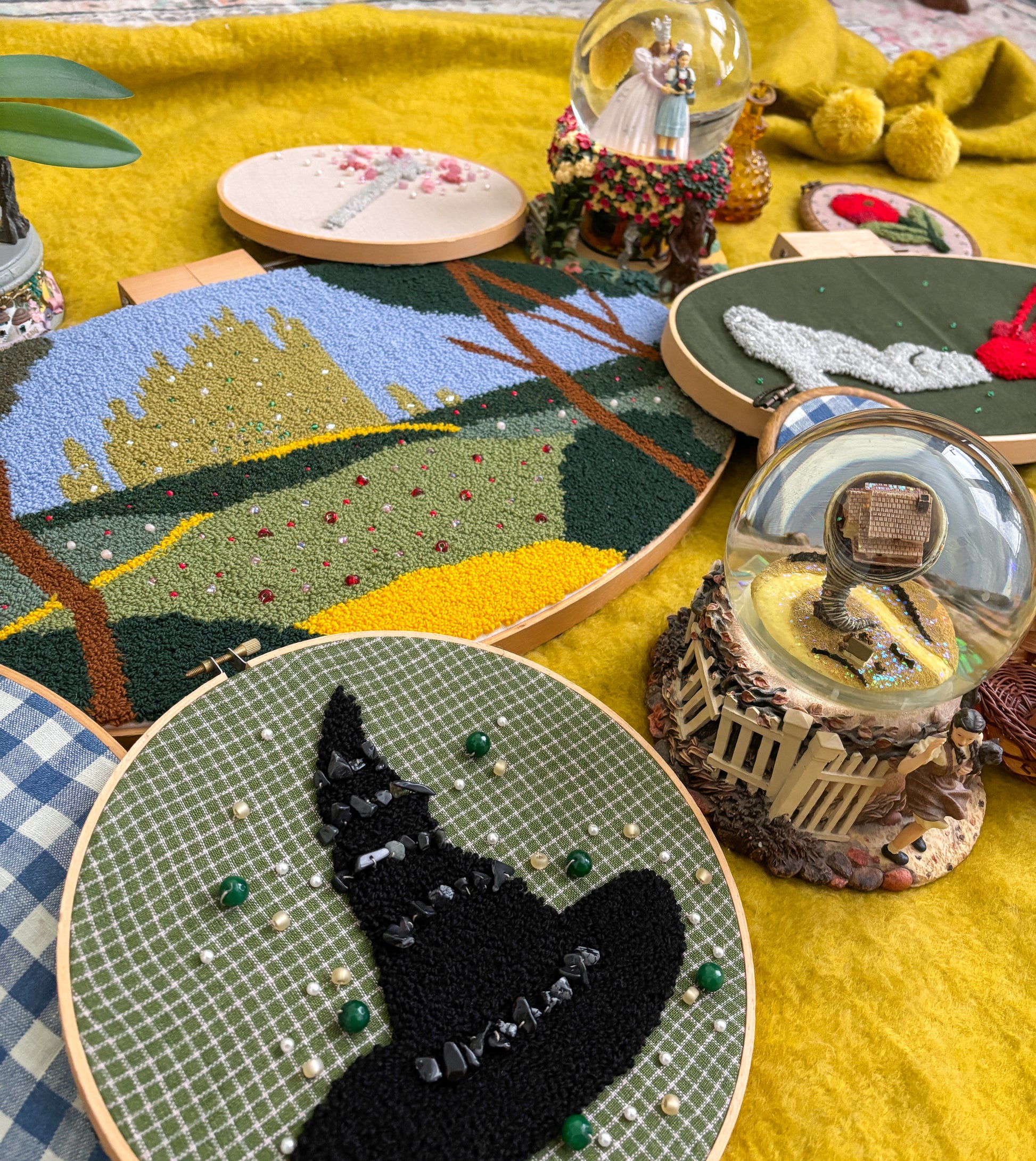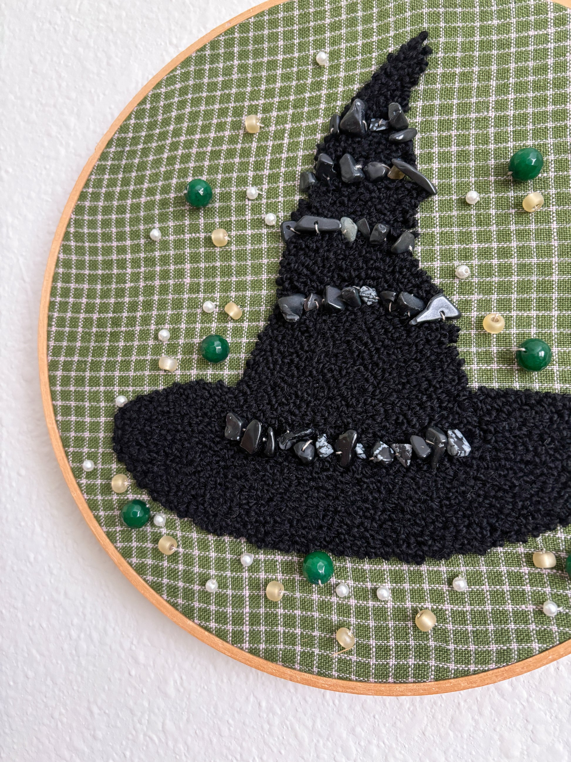 Embroidery hoop, wool yarn, linen fabric.